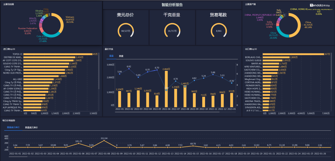 Topay 钱包(中国)外贸通能够一键查询和追踪某类产品的全球交易详情,并体现整个供应链的采购供应,最大程度展示整个贸易网的情况,基于交易数据的统计分析,多维度分析行业、产品市场趋势,助力企业洞察市场变化、把握不同市场采购淡旺季,从而准确定位目标市场。