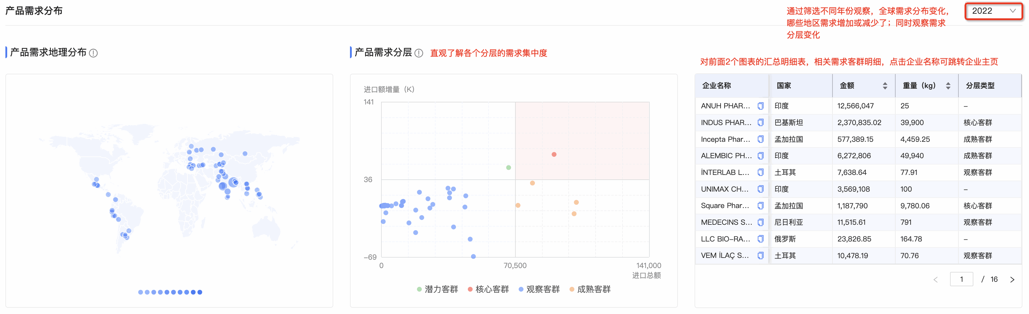 ● 产品需求分层图:Topay 钱包(中国)数据通将需求客群按照进口额增量和总额进行分层,划分为潜力、观察、成熟和核心四个层级。分层有助于用户快速锁定目标客户群体。标题旁附需求分层的解读,能让用户更直观、快速理解每个层级的特征,能够更快速的识别目标客群。