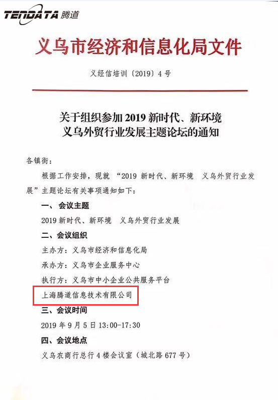 2019年9月5日,义乌市经济和信息化局主办了主题为"2019 新时代、新环境 义乌外贸行业开展"的义乌外贸行业论坛会,会议在义乌农商总行4楼会议室成功举办。旨在帮助义乌市外贸企业分析当前国际贸易环境,促进义乌外贸开展。